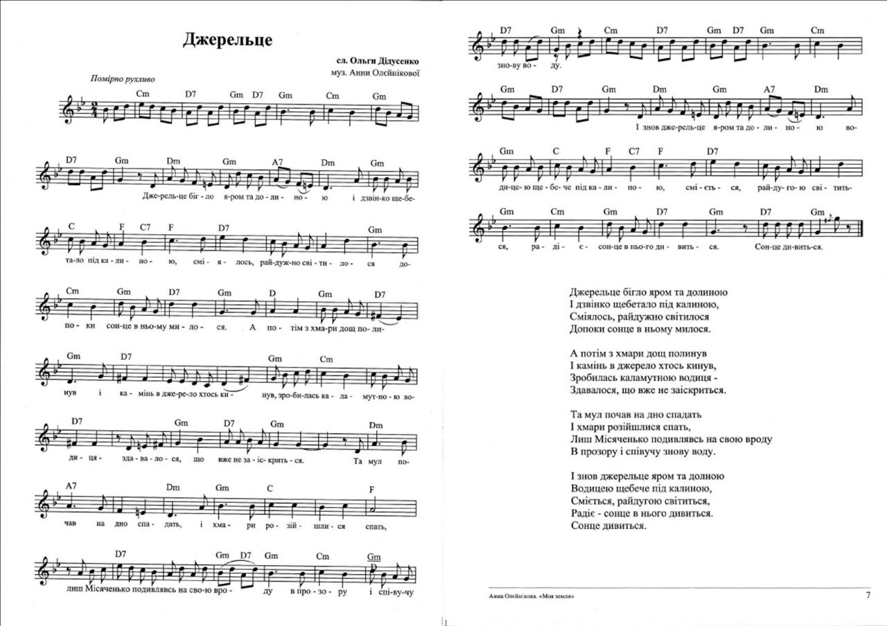 Джерельце (плюс) - муз: Анна Олєйнікова, сл: Ольга Дідусенко Джерельце бігло яром та долиною І дзвінко щебетало під калиною, Сміялось, райдужно світилося Допоки сонце в ньому милося. А потім з хмари дощ полинув І камінь в джерело хтось кинув, Зробилась каламутною водиця - Здавалося, що вже не зайскриться. Та мул почав на дно спадать І хмари розійшлися спать, Лиш Місяченько подивлявсь на свою вроду В прозору і співучу знову воду. І знов джерельце яром та долиною Водицею щебече під калиною, Сміється, райдугою світиться, Радіє - сонце в нього дивиться.